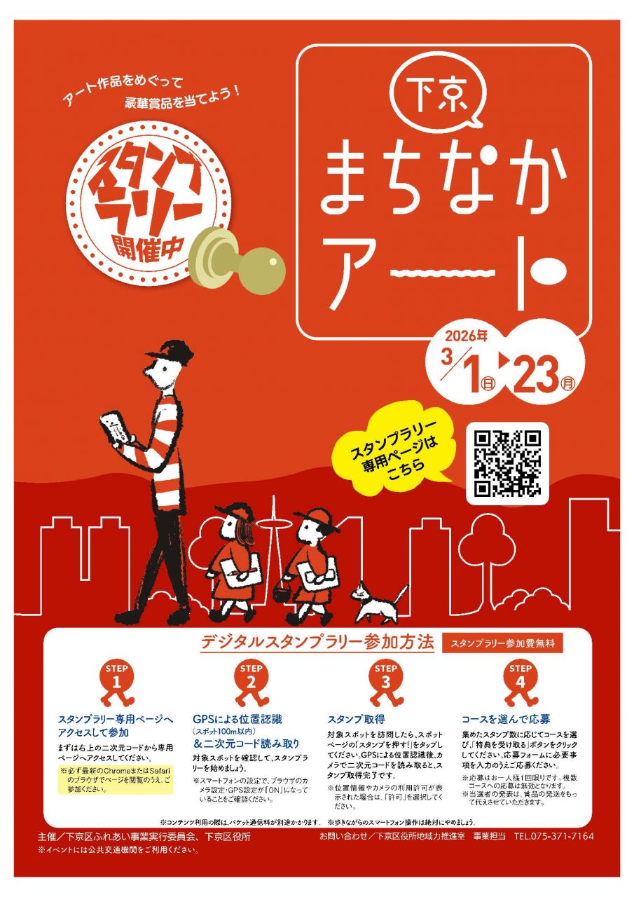 下京区内の商業施設や商店街内の店舗、ホテル等での区内の小中高生や学生、地域の方々が創作した作品の展示や、京都市立芸術大学音楽学部在学生による演奏など、気軽に文化芸術に触れられる楽しいイベントです。あわせて、各展示場所等を巡るとステキな賞品が当たるデジタルスタンプラリーも実施!