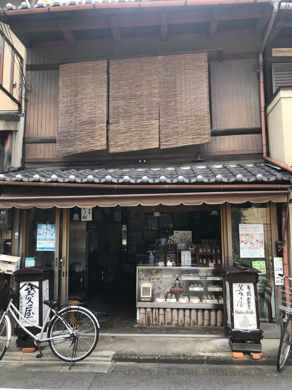 創業明治19年。今から136年前から変わらずに続く手焼き京あられ・おかきの老舗菱屋さん。京都の花街、島原の大門のすぐ近くにお店があります。