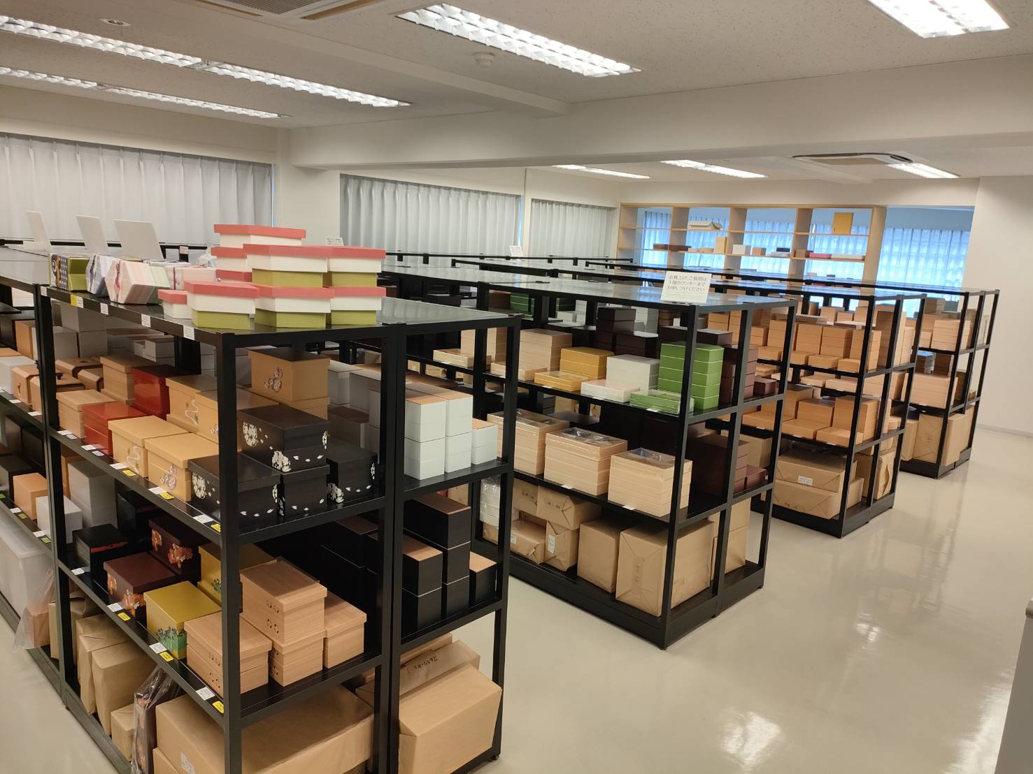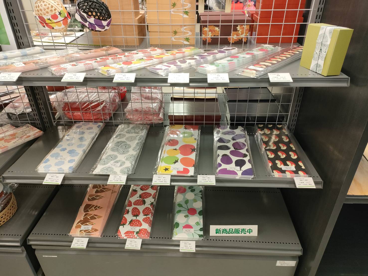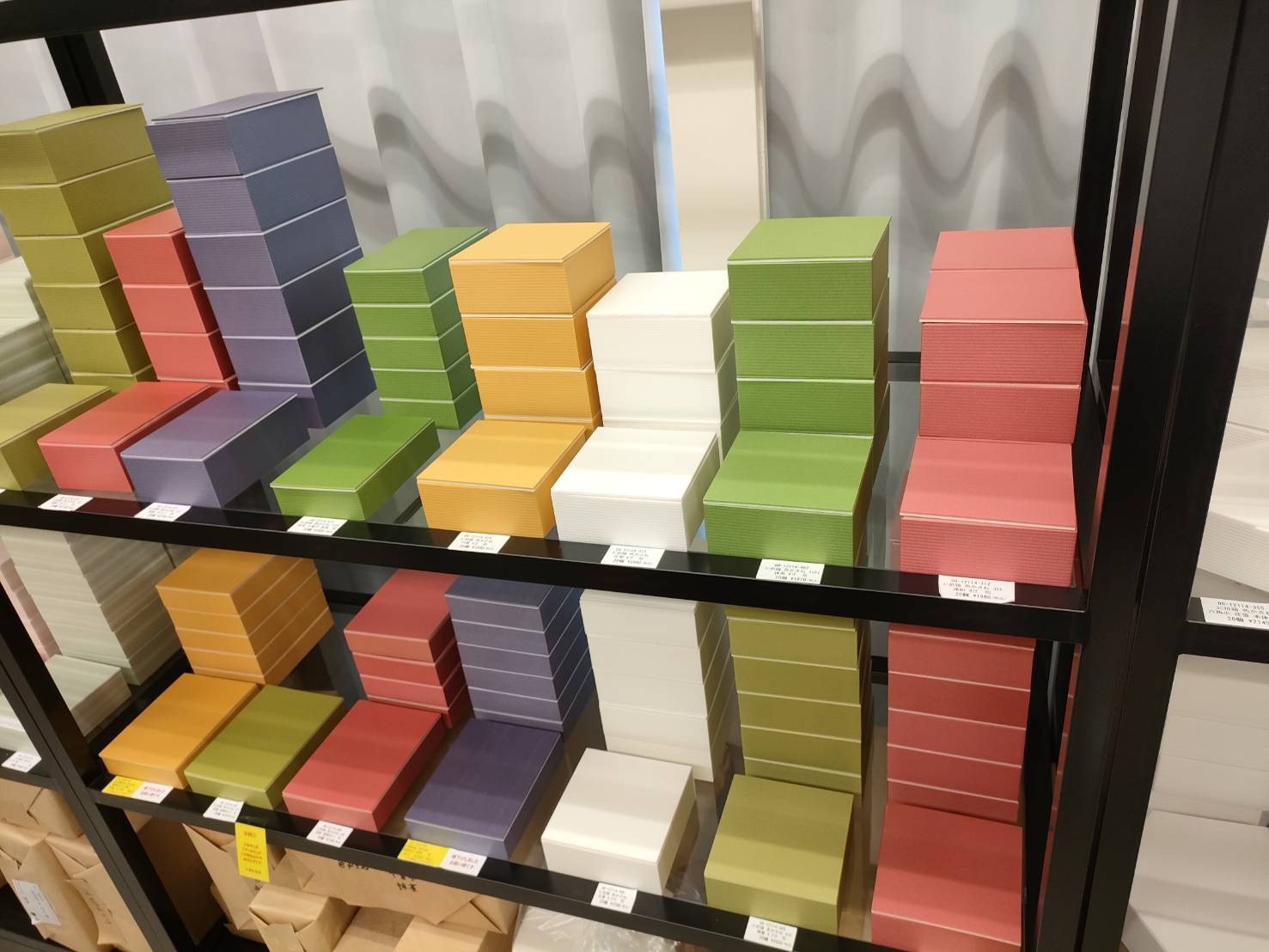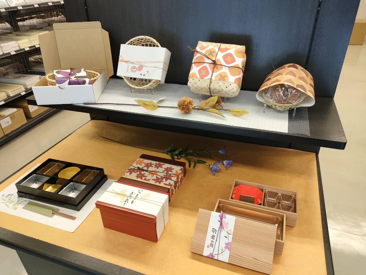 現在、環境負荷低減を意識するお客様が増えているという。包装資材は基本的に使い捨てであることから、プラスチック容器の廃棄がどうにか減らせないかと要求がくるそうだ。そこで勝藤屋では、紙での設計やバイオマスの使用などプラスチック廃棄量低減に繋がる商品開発も実施している。コストなどの課題は残るとのことだが、お客様の要望に応えること、より勝藤屋の商品価値を高めるための取り組みが非常に充実していることがわかる。また、勝藤屋には自社オリジナルの商品が存在する。自社内にデザイン専門の部署があり、店舗にもたくさんのオリジナル商品が並ぶ。さらに、自社オリジナルの折箱のサイズに合う紙袋なども自社デザインで取り扱っている。まさに、何でも揃うとはこのことだ。